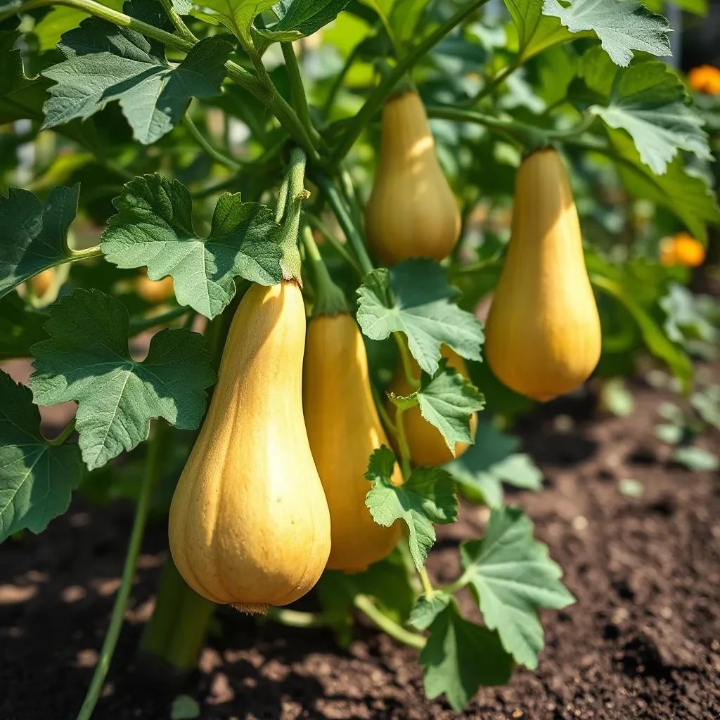 Butternut squash is a beautiful trailing vine that produces a common Winter squash grown in many parts of the world. This plant produces a nutritious, mildly sweet vegetable that is crunchy when raw and soft when cooked, commonly used for a variety of dishes.